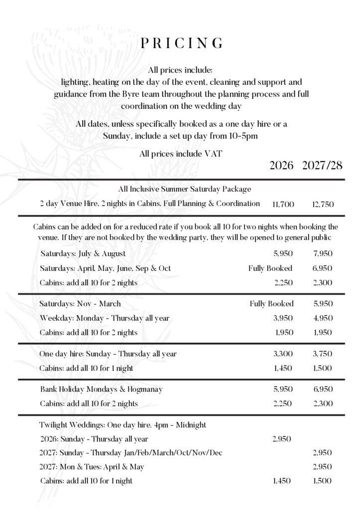 The best time to view the venue would be the evening before a wedding – this is usually a Friday but we can also do most Sundays and some midweek dates – email us at info@kinkell.com to book in your showround!